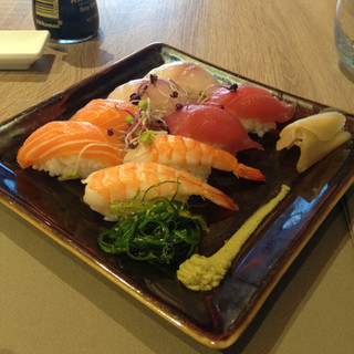 Pour ma part, j’ai commandé un assortiment de huit Nigiris Mix (thon, saumon, loup, crevette) à 24.- chf. Ils étaient bons, mais pas d’une grande finesse et notamment le riz ! Pour preuve, j’ai réservé spécialement un restaurant japonais et remangé le midi d’après, des sushis pour m'en faire une vrais idée et je dirais que c’était le jour et la nuit ! A suivre dans mon prochain post.