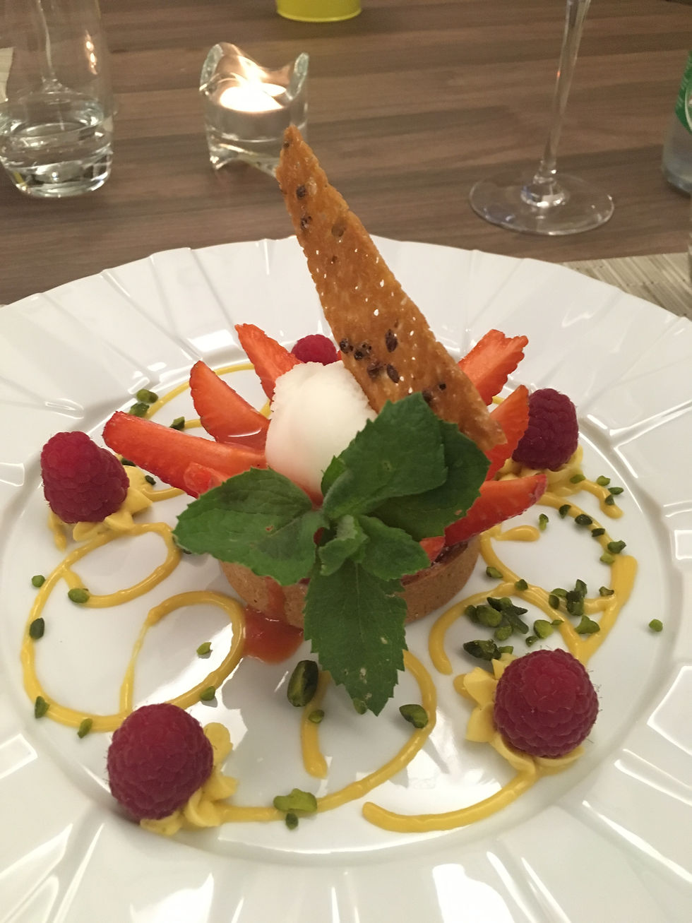 Notre repas, c’est terminé avec deux bons desserts. Un « Ce fameux, Paris-Bresse The Garden » à 15.- chf et une tartelette spéculos et fruits frais, sorbet yuzu à 13.- chf.