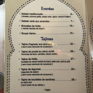 Avant ce délice culinaire, j’ai pris deux entrées ; des Briwattes de Kefta, à 10.-chf et bien sûr la soupe Harira, elle aussi à 10.- chf. Pour être honnête, j’ai été moins convaincu par mes entrées. Attention, elles étaient bonnes, mais en tout cas pour la soupe, je m’attendais à quelque chose de plus typé, mieux garni et surtout plus parfumé. Je voulais voyager dans le monde merveilleux des épices .