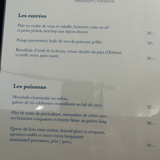 Mon addition du jour : 120.- chf, avec une eau filtrée à 5.- chf, un verre de Calamin à 8.- chf, le pâté en croûte à 26.- chf, mon menu du jour à 65.- chf et deux verres de rouge à 16.- chf. Le café m’a été gentiment offert. Merci.
