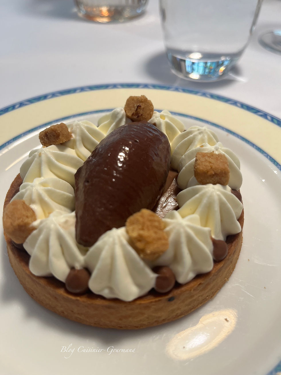 Pour terminer mon repas, un excellent dessert : une tarte aux trois chocolats et sorbet cacao.