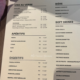 La carte, écrite en «patois vaudois», met en valeur le terroir local et suisse à prix doux, entre 12.- chf (les desserts) et 40.- chf pour le plat le plus cher : l’entrecôte de bœuf, jus de viande, béarnaise, gnudi.